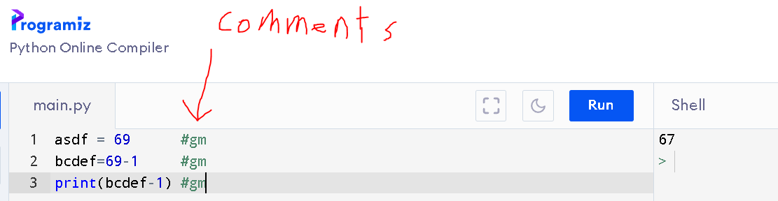 In Python, we use the # symbol for making comments. Anything you write after the # Python will completely ignore, and you can pretty much go crazy here, and say whatever you like. You can look at the screenshot below for an example: