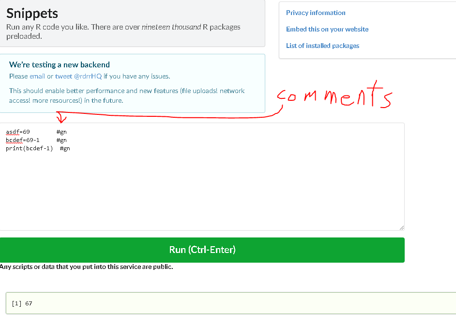 For teaching purposes, I am using an online version of R: https://rdrr.io/snippets/