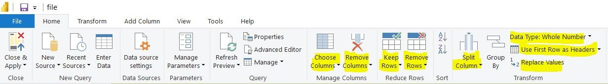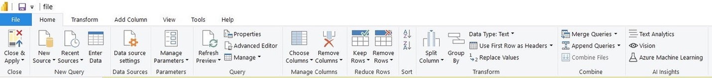 Once launched, the top of the screen is a navigation ribbon with several tabs for further navigation and frequently used transformation options. These buttons provide options for cleaning or shaping or transforming your data that are comparable to a lot of the general python or pandas functions.