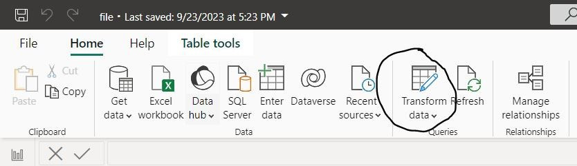 You can access Power Query directly when connecting a data source to Power BI (above). You can also do it later after a data source has been added through the "transform data" button on the navigation ribbon (below). Clicking this button launches Power Query.