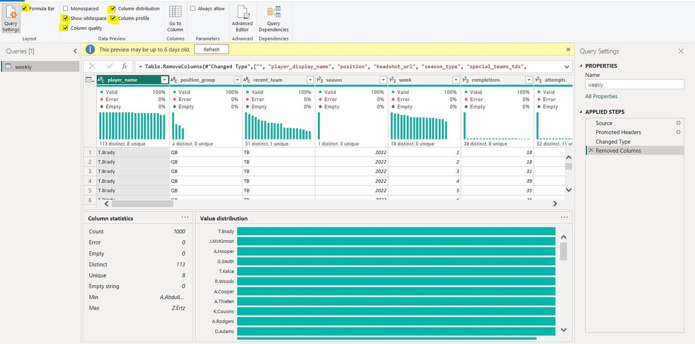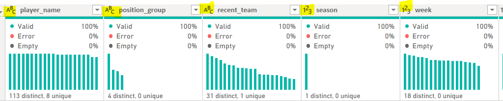 You can toggle things like column distribution, column profile, and column quality to give an overview of different aspects of your data. This can give you clues as to why errors are occurring in your visualizations and what transformations need to be done to fix these errors.