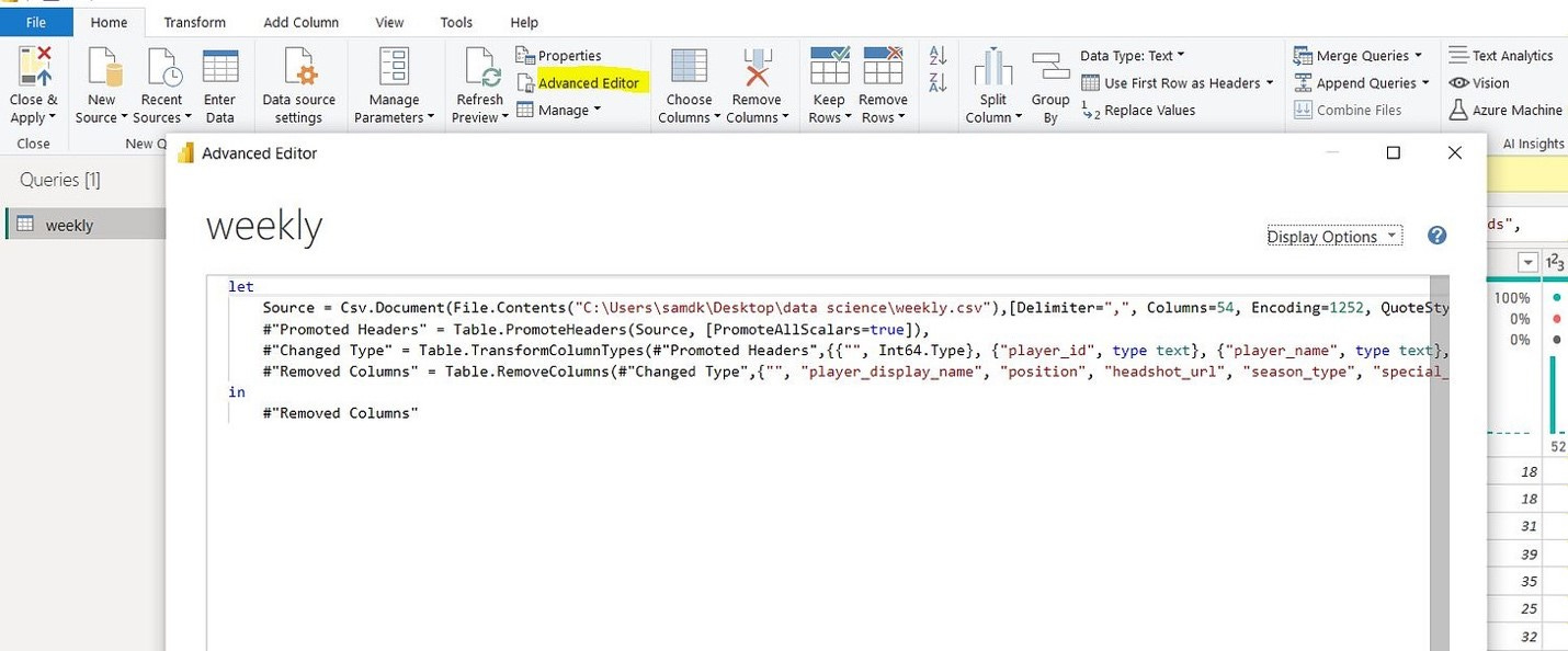 At the top of your page there is a button to click on that reads advanced editor. This button allows you to see the “M-code” that your queries generate. M is the language used to data transformation in Power Query. Each step in the code transforms data in a specific way, your final result being a structured table that is easily loaded into Power BI. M-code allows you to easily being a complex transformation process into other files. You can dig as deep into M as you want, I always use the Power Query GUI to build my transformations. I have copied M code a couple of times to bring transformation processes from one query to another.