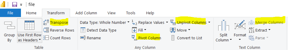 Transpose: This transposes the rows and column in Power Query. Compare to .transpose() in Python.